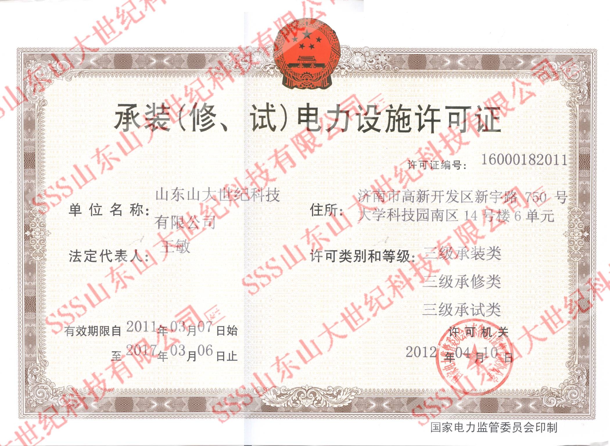 4月12日,山東省電監(jiān)辦資質處正式向我公司頒發(fā)了三級承裝(修、試)電力設施許可證。