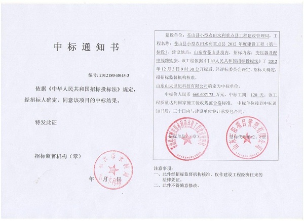 慶祝公司中標蒼山縣小型農(nóng)田水利項目變壓器及配電線路購安工程
