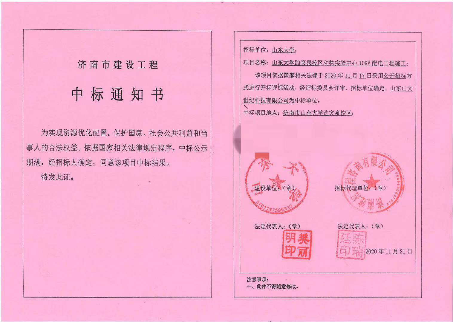 熱烈祝賀山大世紀(jì)公司中標(biāo)“山東大學(xué)趵突泉校區(qū)動(dòng)物實(shí)驗(yàn)中心10KV配電工程施工項(xiàng)目”